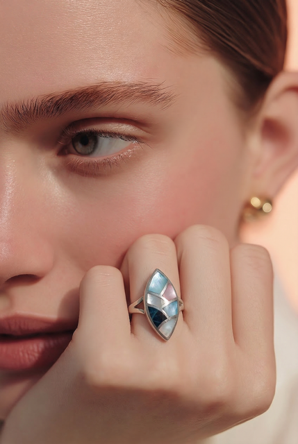 Cette bague est un choix magnifique et intemporel. L’alliance de l’éclat lunaire de l’argent et des reflets irisés de la nacre crée un bijou à la fois doux et élégant.