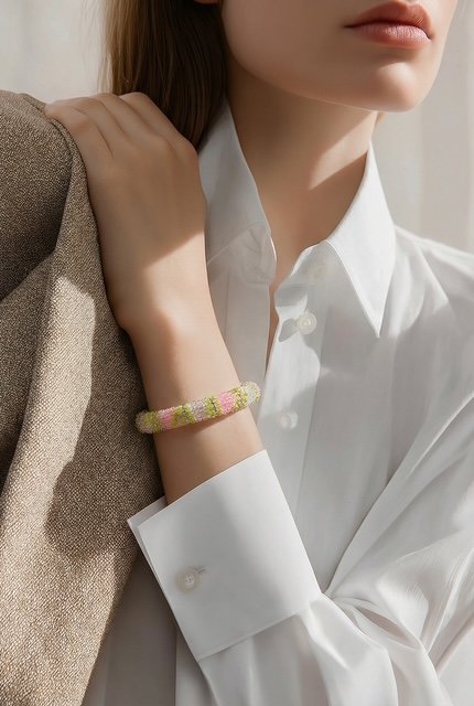 Le contraste : L’éclat lisse et brillant des joncs dorés met magnifiquement en valeur le travail mat ou irisé des perles de verre.